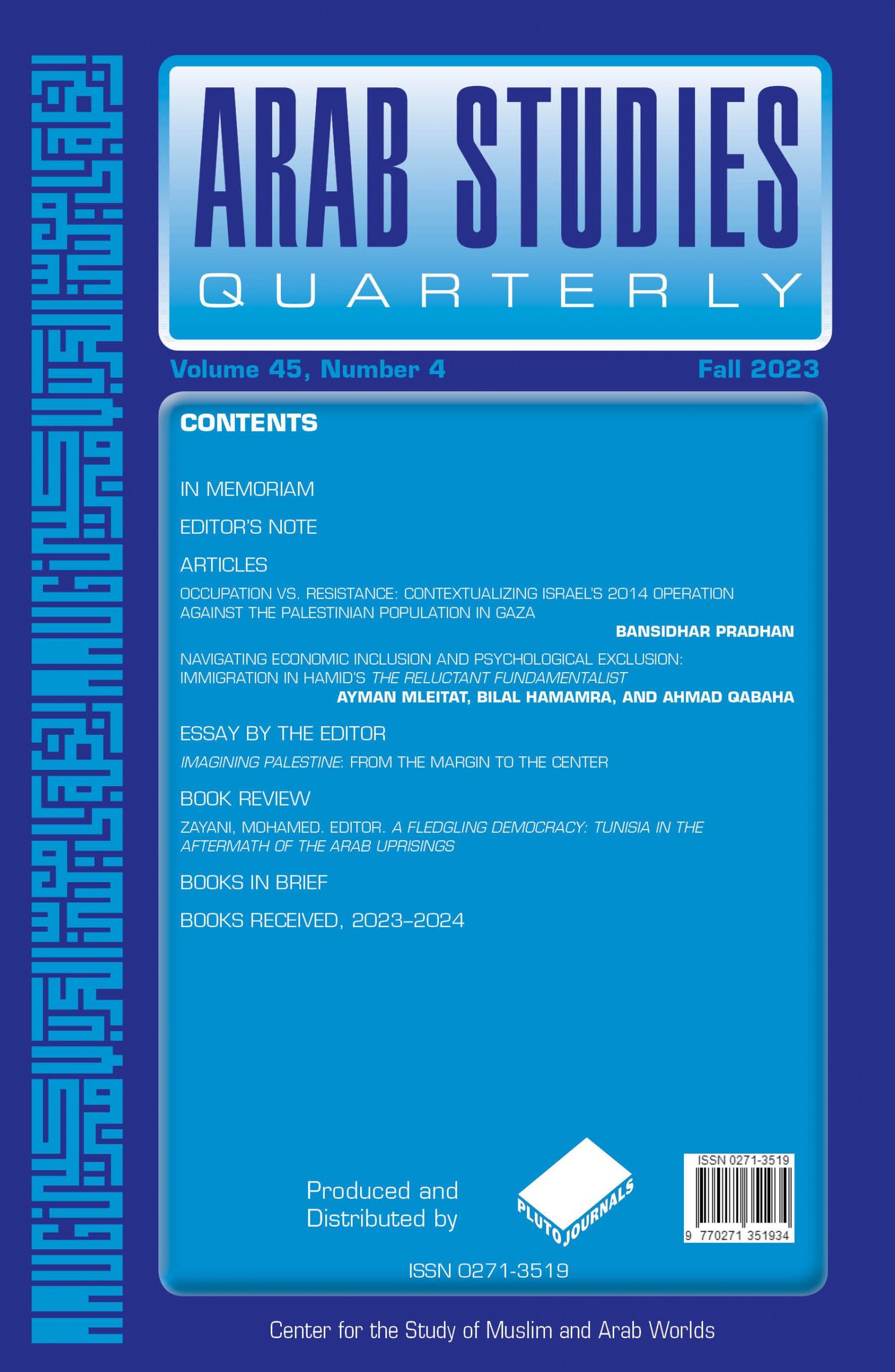 In the latest issue of Arab Studies Quarterly Volume 45 Issue 4, Bansidhar Pradhan argues that the 2014 operation, code named “Operation Protective Edge,” was but a part of Israel’s long-term, well-thought-out, and consistently pursued policy of crushing Palestinian resistance and eliminating Palestinian identity and nationalism in Occupation vs. Resistance: Contextualizing Israel’s 2014 Operation Against the Palestinian Population in Gaza. In Navigating Economic Inclusion and Psychological Exclusion: Immigration in Hamid’s The Reluctant Fundamentalist, Ayman Mleitat, Bilal Hamamra, and Ahmad Qabaha offer a comprehensive analysis of Changez’s struggle for acceptance in America by placing his experiences as an immigrant within the broader political and socio-economic global system. There is also a timely essay by the editor, Ibrahim G. Aoudé, titled Imagining Palestine: From the Margin to the Center which concludes that the culture of resistance in concert with the armed struggle will empower the marginalised in realising this objective. Tahrir Hamdi’s Imagining Palestine reaffirms this thesis of liberation.